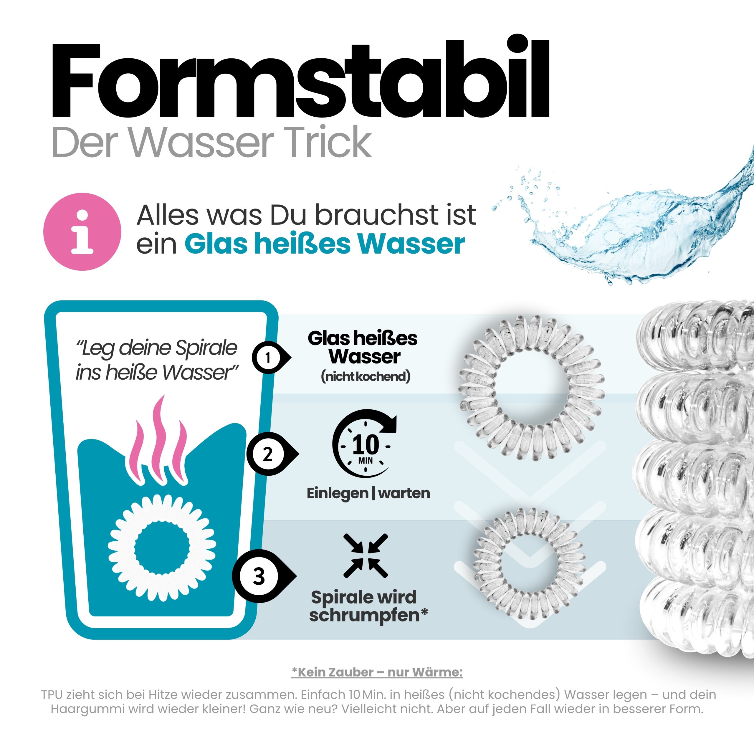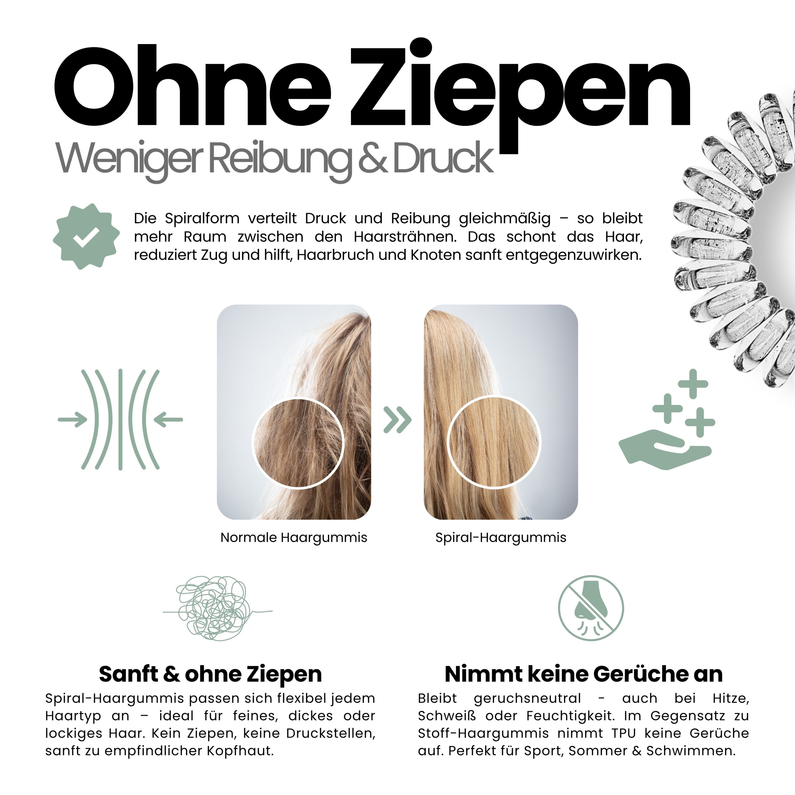 Angenehm zu tragen, sicher im Halt und sanft zu trockenem und nassem Haar. Im 10er Pack – Sortenrein in der Farbe Transparent. TPU ist pflegeleicht und wasserfreundlich, nimmt keine störenden Gerüche an, wie textile Haargummis, resistent gegen Haargerüche, Schweiß, und macht sich nichts aus trockenen oder fettigen Haaren. Unsere Spiral Haargummis sind Allrounder, ideal für Alltag, Sport und Tage am Wasser.