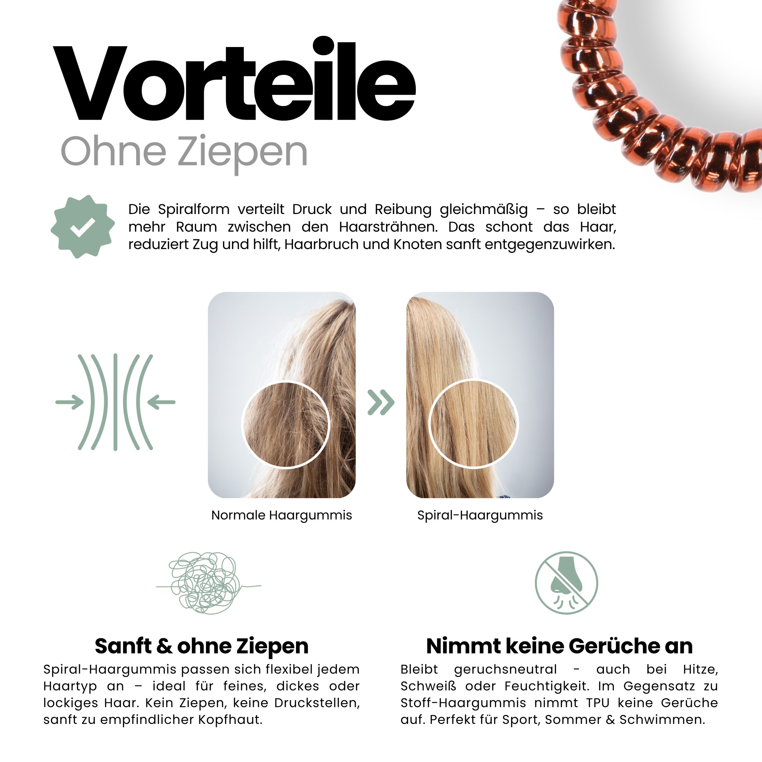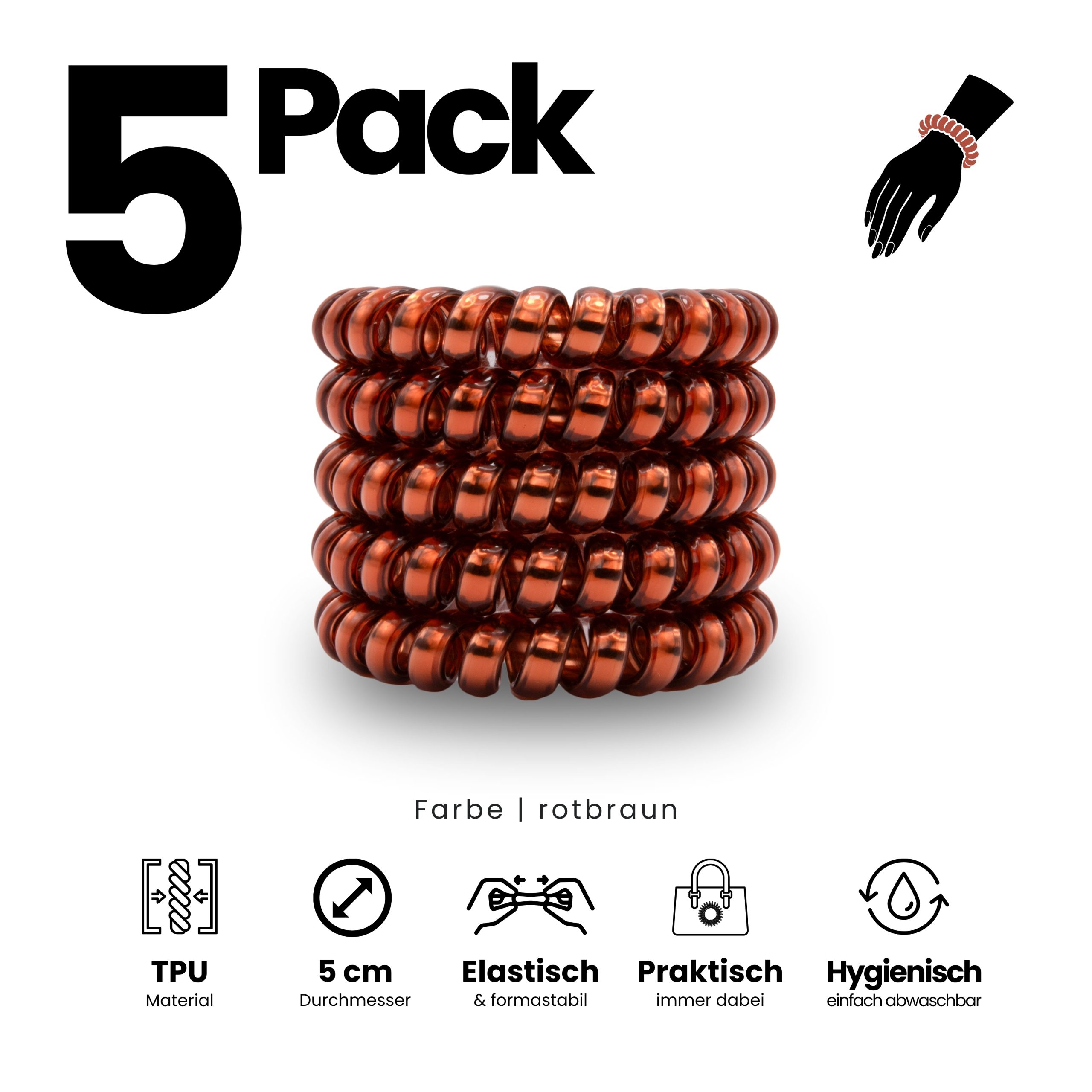 Angenehm zu tragen, sicher im Halt und sanft zu trockenem und nassem Haar. Im 5er Pack – Sortenrein in der Farbe Rot-Braun. TPU ist pflegeleicht und wasserfreundlich, nimmt keine störenden Gerüche an, wie textile Haargummis, resistent gegen Haargerüche, Schweiß, und macht sich nichts aus trockenen oder fettigen Haaren. Unsere Spiral Haargummis sind Allrounder, ideal für Alltag, Sport und Tage am Wasser.