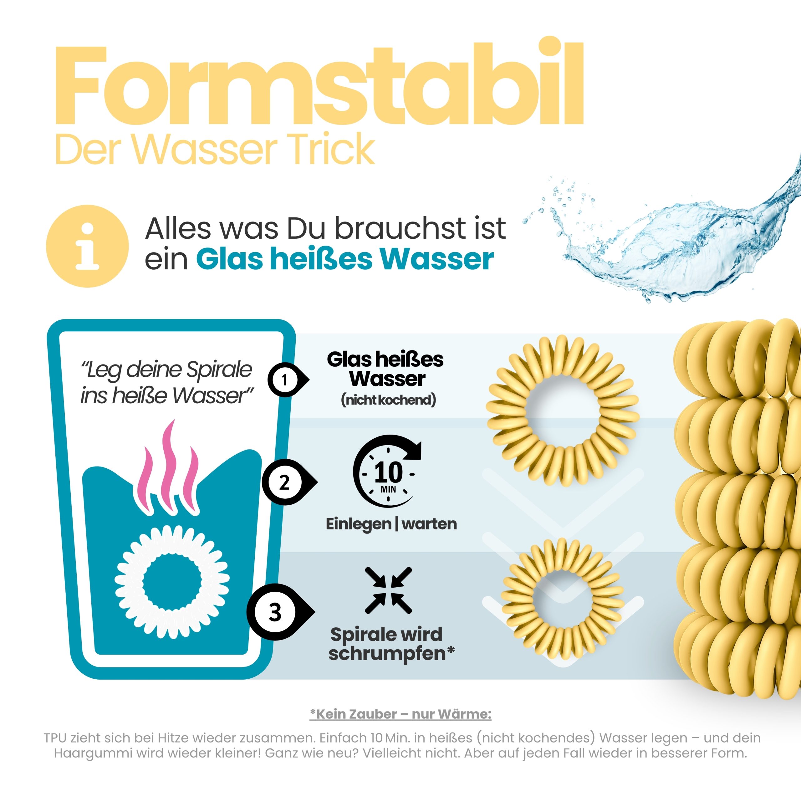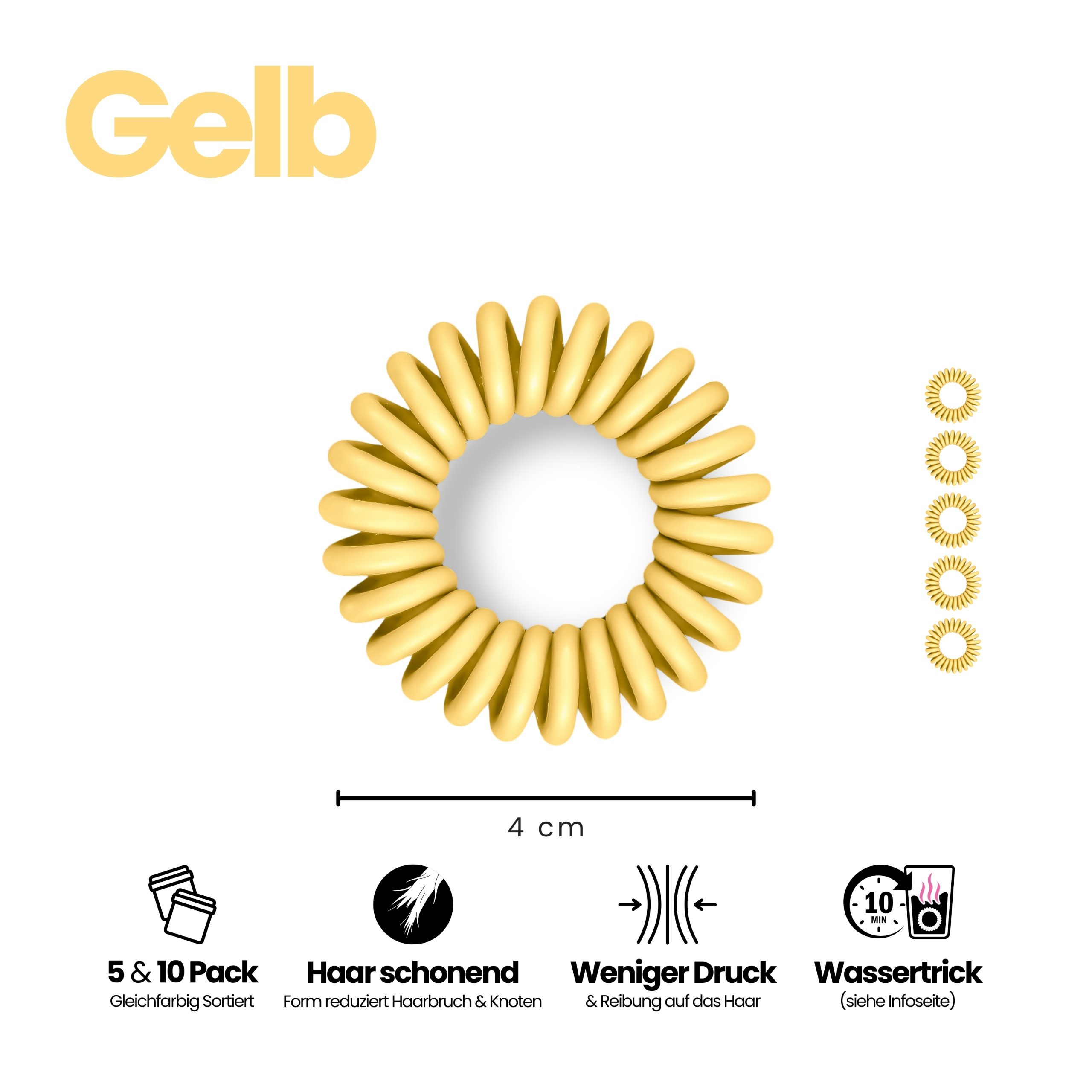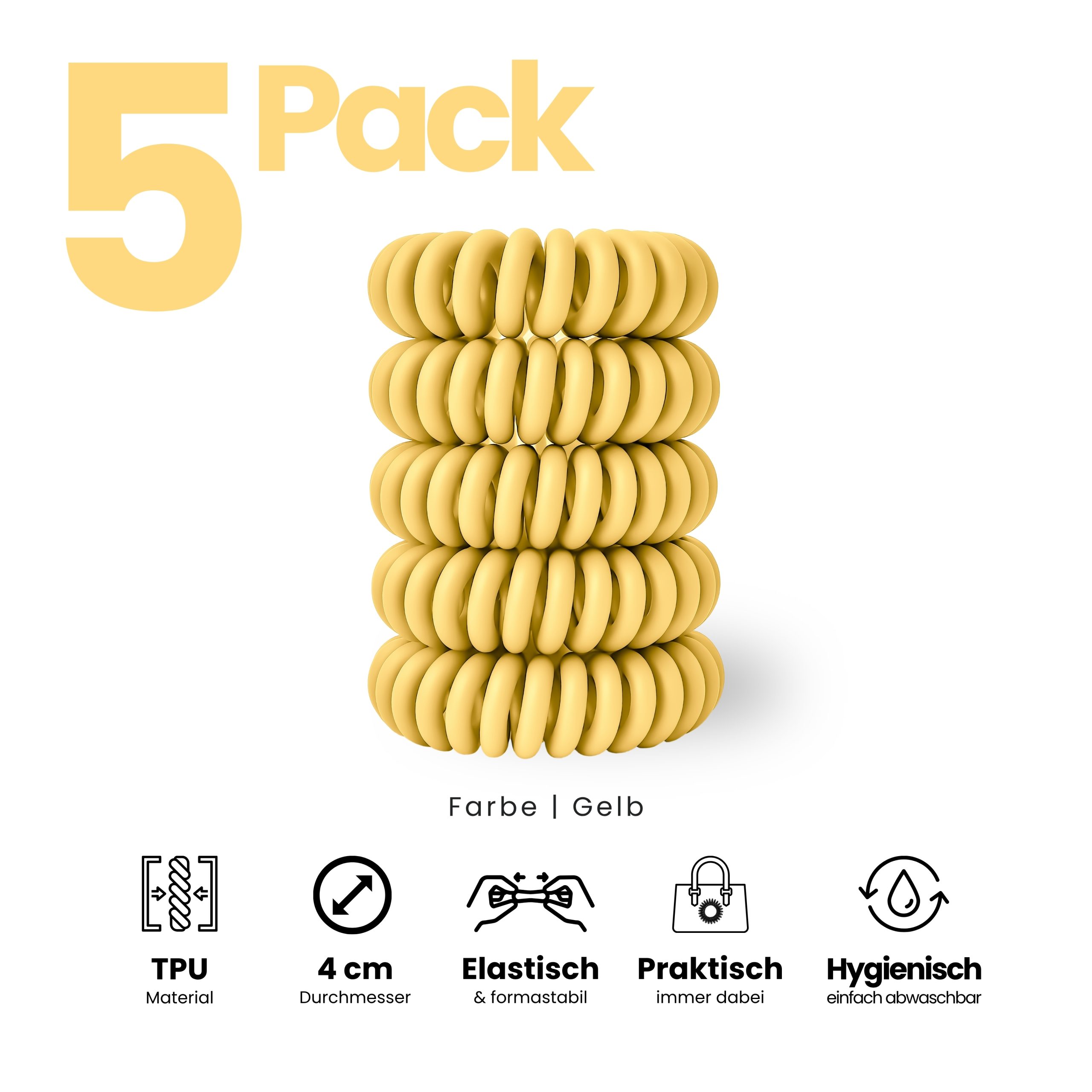 Angenehm zu tragen, sicher im Halt und sanft zu trockenem und nassem Haar. Im 5er Pack – Sortenrein in der Farbe Gelb. TPU ist pflegeleicht und wasserfreundlich, nimmt keine störenden Gerüche an, wie textile Haargummis, resistent gegen Haargerüche, Schweiß, und macht sich nichts aus trockenen oder fettigen Haaren. Unsere Spiral Haargummis sind Allrounder, ideal für Alltag, Sport und Tage am Wasser.