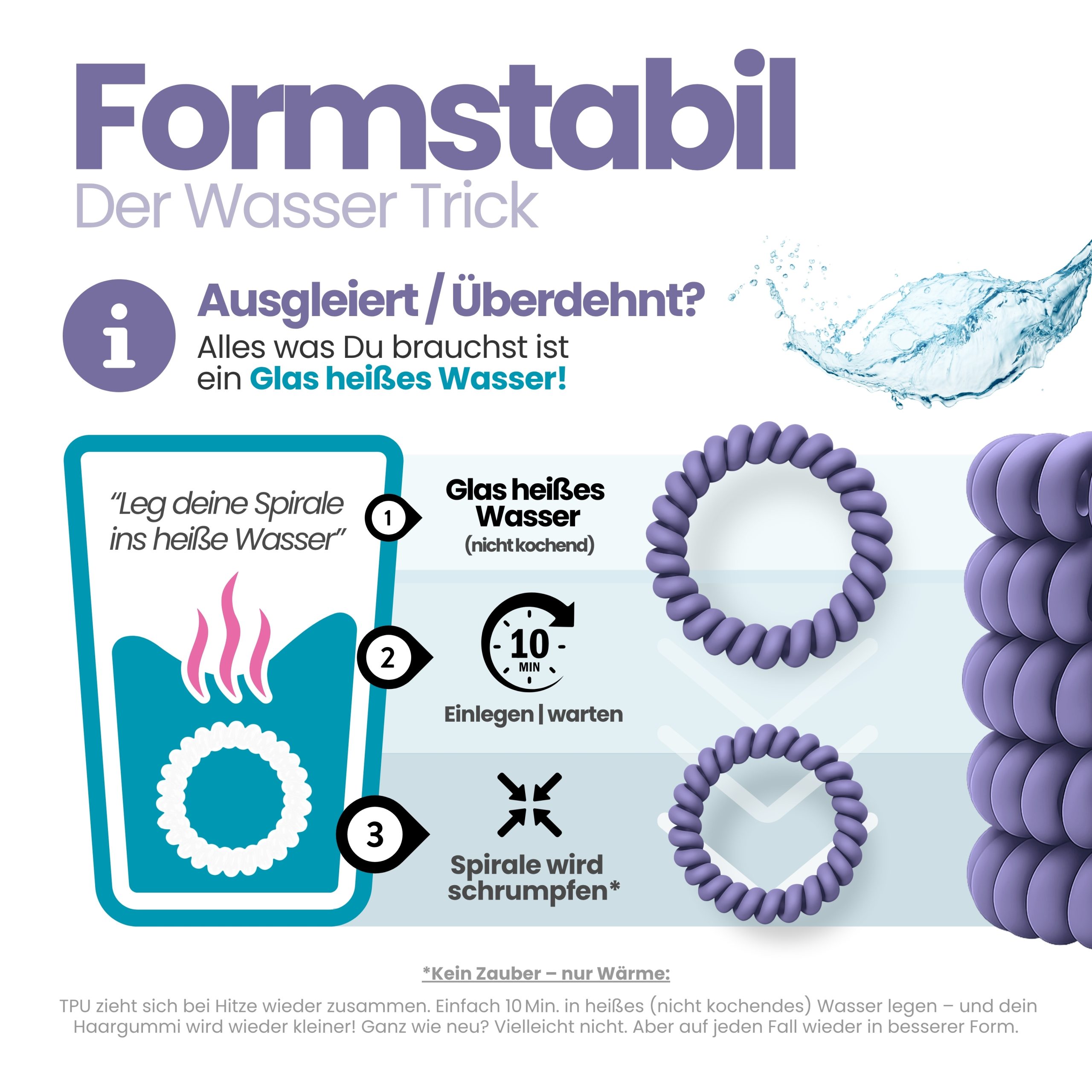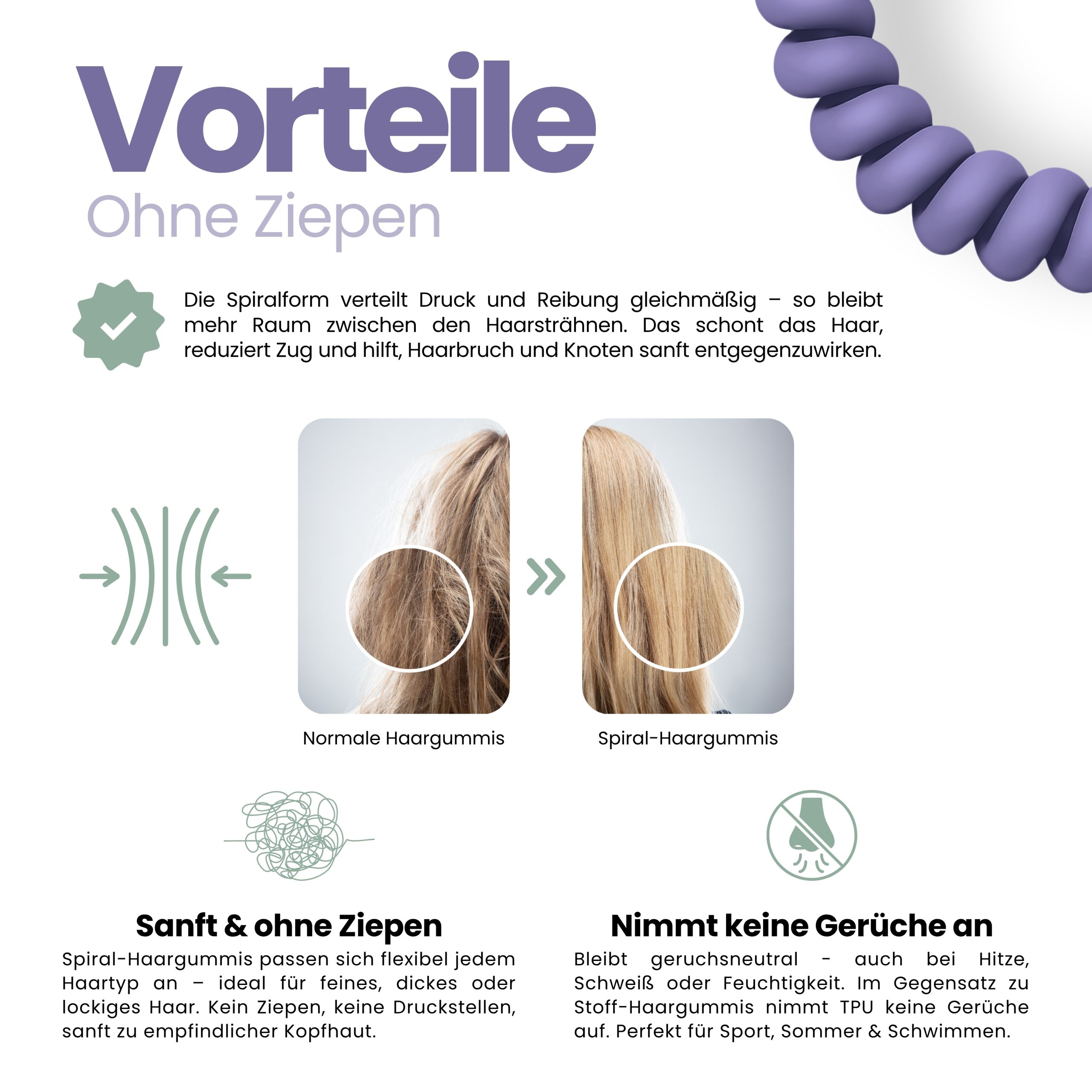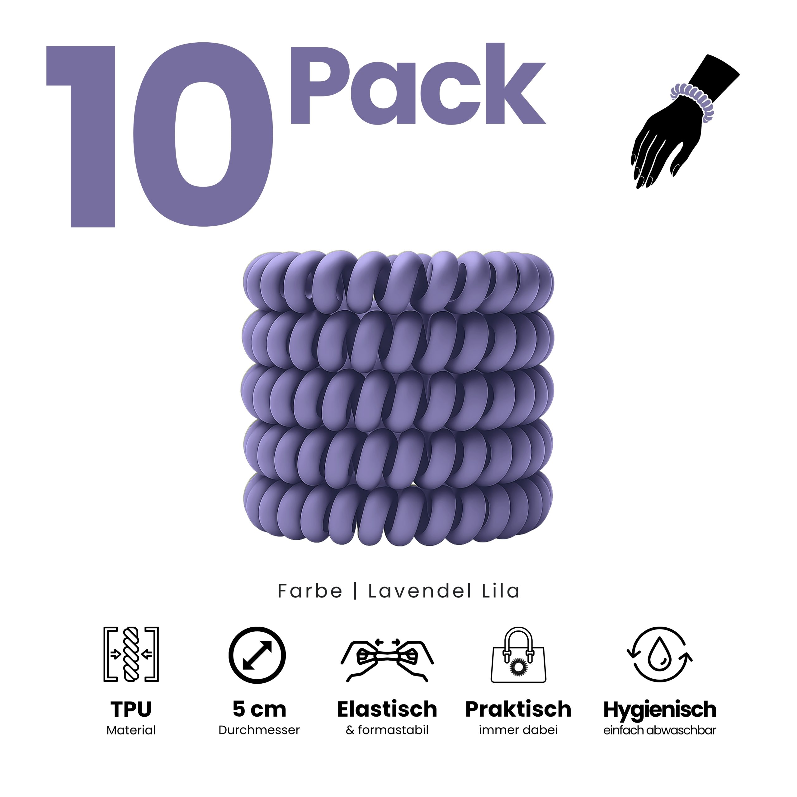 Angenehm zu tragen, sicher im Halt und sanft zu trockenem und nassem Haar. Im 10er Pack – Sortenrein in der Farbe Lavendel. TPU ist pflegeleicht und wasserfreundlich, nimmt keine störenden Gerüche an, wie textile Haargummis, resistent gegen Haargerüche, Schweiß, und macht sich nichts aus trockenen oder fettigen Haaren. Unsere Spiral Haargummis sind Allrounder, ideal für Alltag, Sport und Tage am Wasser.