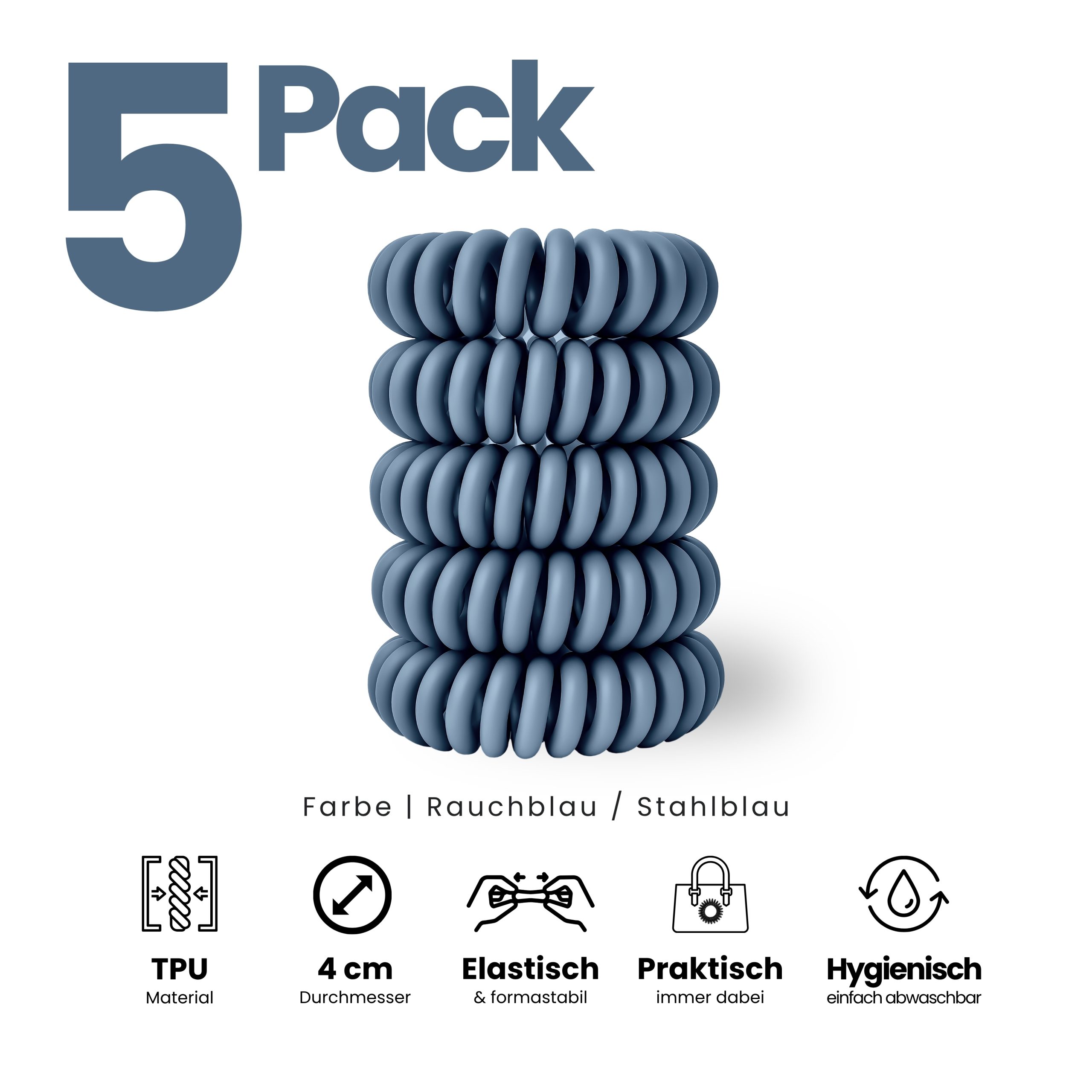 Angenehm zu tragen, sicher im Halt und sanft zu trockenem und nassem Haar. Im 5er Pack – Sortenrein in der Farbe Rauchblau. TPU ist pflegeleicht und wasserfreundlich, nimmt keine störenden Gerüche an, wie textile Haargummis, resistent gegen Haargerüche, Schweiß, und macht sich nichts aus trockenen oder fettigen Haaren. Unsere Spiral Haargummis sind Allrounder, ideal für Alltag, Sport und Tage am Wasser.