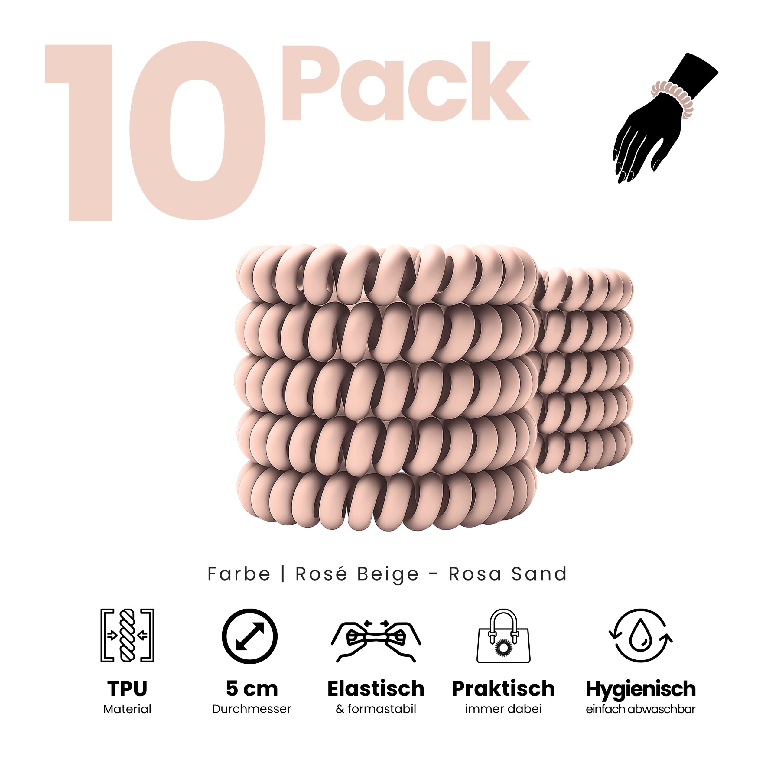 Angenehm zu tragen, sicher im Halt und sanft zu trockenem und nassem Haar. Im 10er Pack – Sortenrein in der Farbe Rosé Beige. TPU ist pflegeleicht und wasserfreundlich, nimmt keine störenden Gerüche an, wie textile Haargummis, resistent gegen Haargerüche, Schweiß, und macht sich nichts aus trockenen oder fettigen Haaren. Unsere Spiral Haargummis sind Allrounder, ideal für Alltag, Sport und Tage am Wasser.
